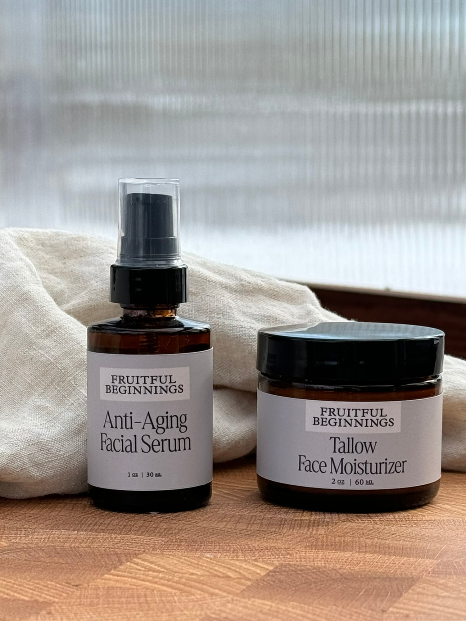 This simple, highly effective two-step set pairs our bestselling Tallow Face Moisturizer with our nutrient-rich Anti-Aging Facial Serum to deeply hydrate, brighten, and restore balance to dry, sensitive, or mature skin. Together, they deliver powerful vitamins, antioxidants, and barrier-supporting nutrients that soften fine lines, even skin tone, and revive dull or tired complexions—naturally and gently.