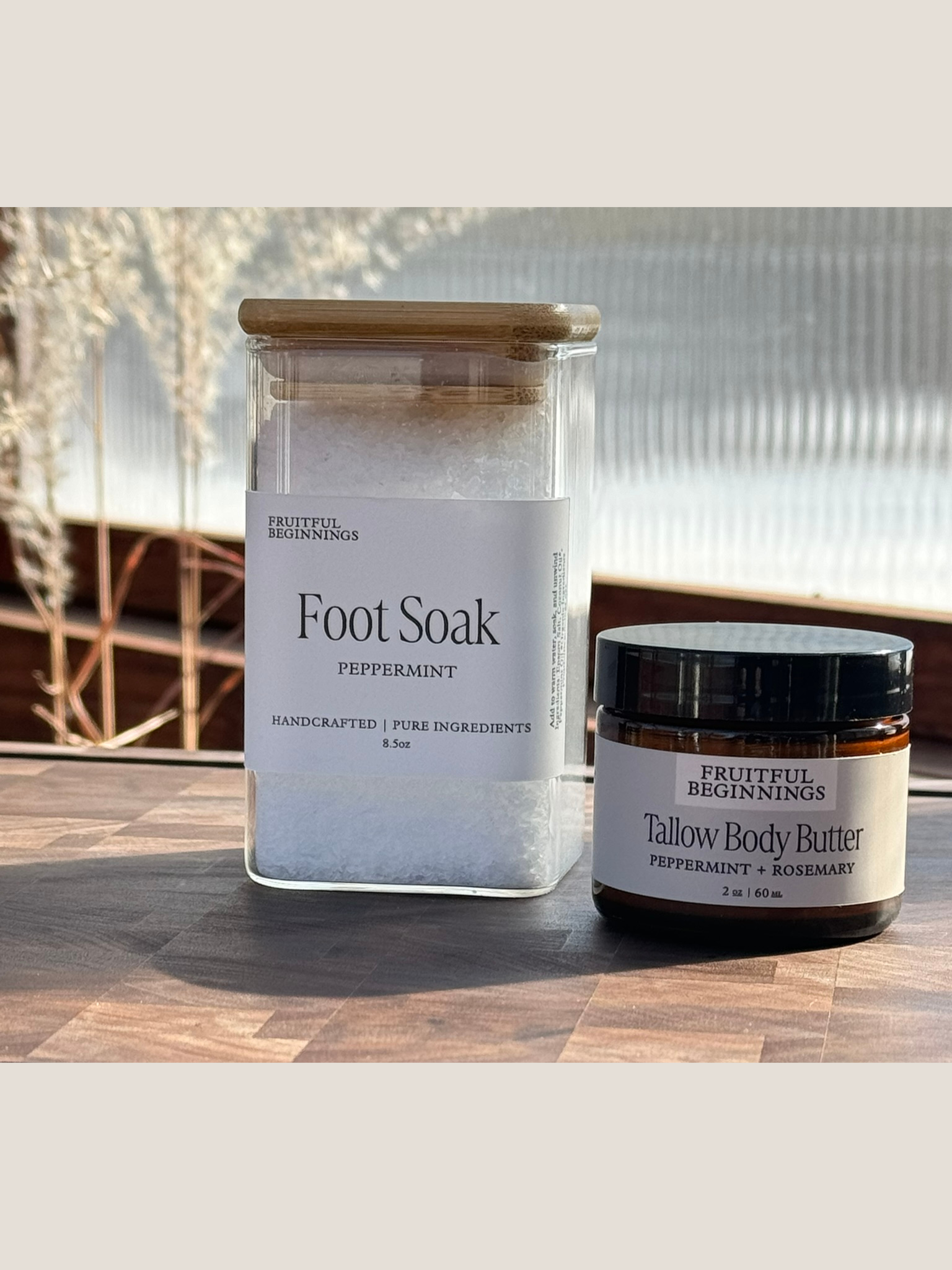 Give hardworking feet the care they deserve with our Winter Foot Revival Gift Set — a refreshing peppermint foot soak paired with deeply nourishing tallow body butter for the ultimate clean, at-home spa experience.